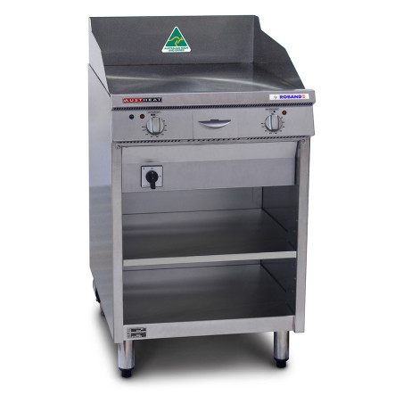 12mm thick heavy duty machined steel hot plate with separate controls for left and right side of hot plate. 645 x 585mm cooking plate. Extra storage space under the steel hotplate. Removable shelf for easy cleaning - 3 step adjustment. Castors on the rear and adjustable legs at the front.