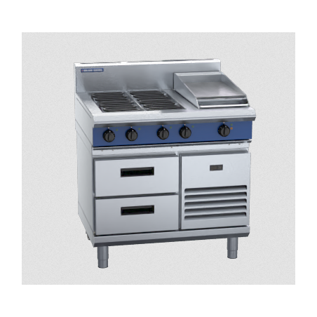 4 radiant elements cooktop with 300mm griddle on refrigerated base