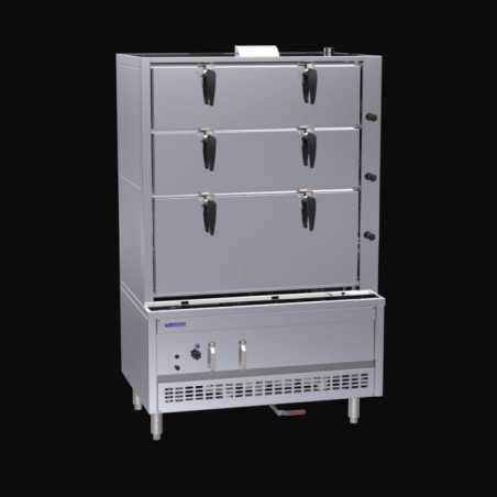 1200mm 3 Deck Steam Cabinet with ultra-efficient heat exchange system. Features flame failure, auto tank refill, pressure release valve and rotary door