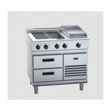 4 radiant element cooktop with 300mm griddle on refrigerated base