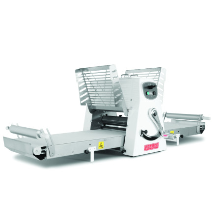 The Sirio dough sheeters are designed to produce very thin sheets of dough free from wrinkles or tears. The fold-up surfaces and shielded bearings ensure maximum efficiency and cleanliness. The digital display and newly designed intuitive joystick ensure optimal dough thickness with minimal effort, for improved baking and shape to produce pastries and cakes that are as beautiful as they are delicious. The rolling direction can be reversed with ease via joystick and foot pedal. Available as a benchtop or freestanding model and in single or variable speed configurations. The Sirio comes in two belt widths based on your requirements: 500 or 600mm. On the freestanding models the shelves can be folded to reduce the overall dimensions when the machine is at rest and are mounted on wheels for easy movement. The Sirio 500/850 is a benchtop machine and is distinguished by its single speed operation and 850mm x 500mm belts on either side.
